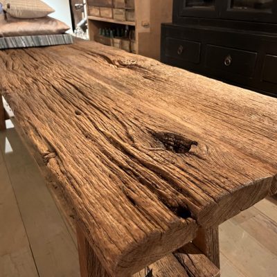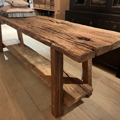 Grande console rustique avec une étagère de base, en chêne vert grossier.