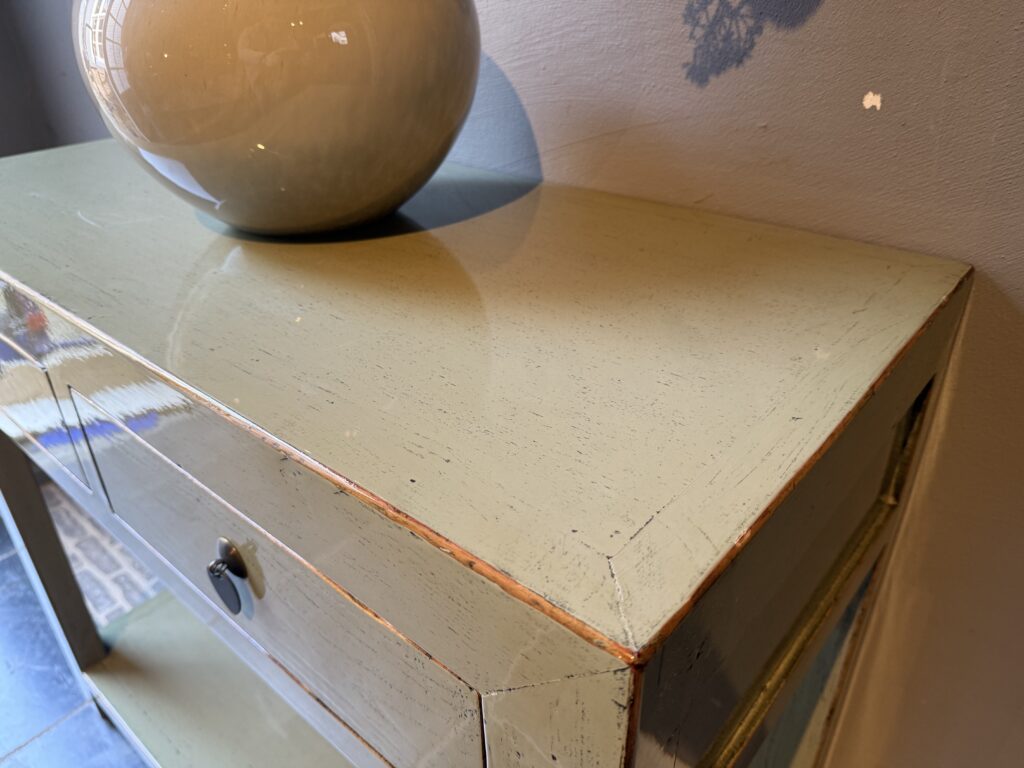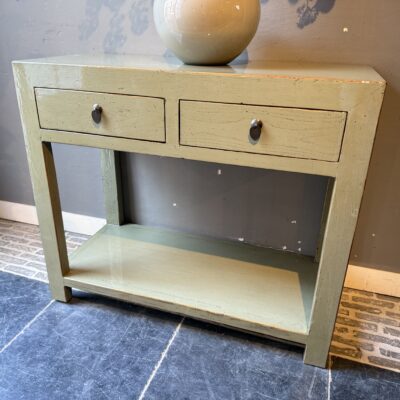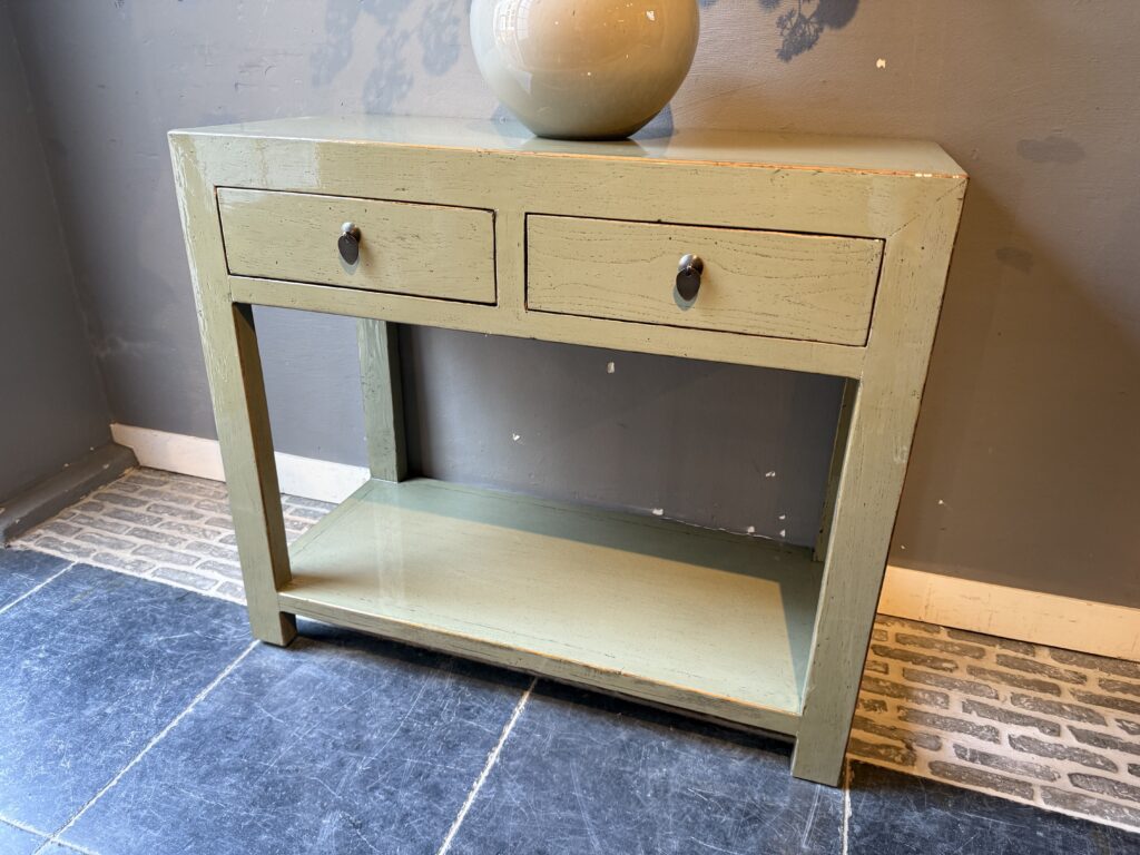 Table console ‘Savona 100CM’ en laqué gris clair. Existe également en vieux bois de pin naturel.