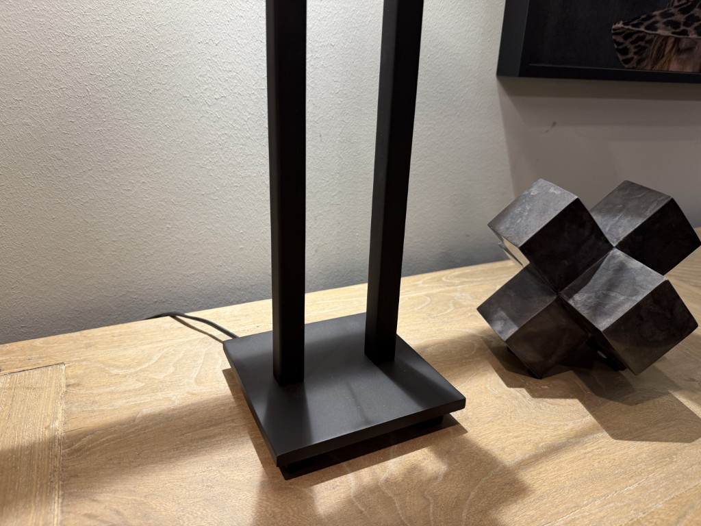 Lampe de table ‘Diable’, composée d’une base en métal et d’un abat-jour en tissu.
