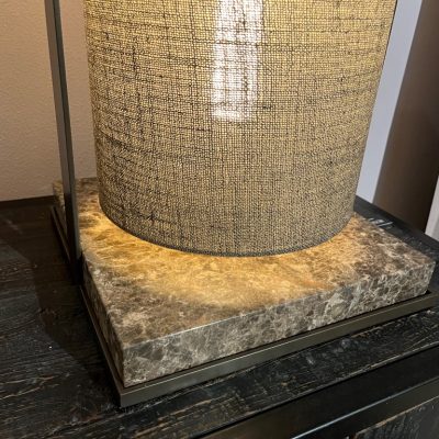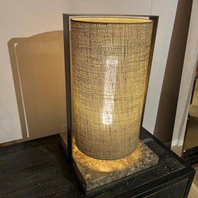 Lampe ‘Tube Marble’ de la marque By Eve. La lampe a une base en marbre et un abat-jour en tissu.