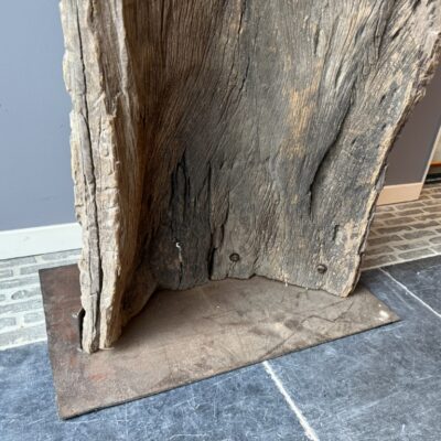 Objet décoratif, fait d’un tronc d’arbre sur une plaque de sol en métal.