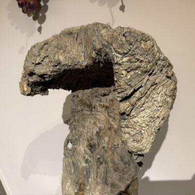 Objet ornemental décoratif en bois d’orme sur un piédestal en métal.