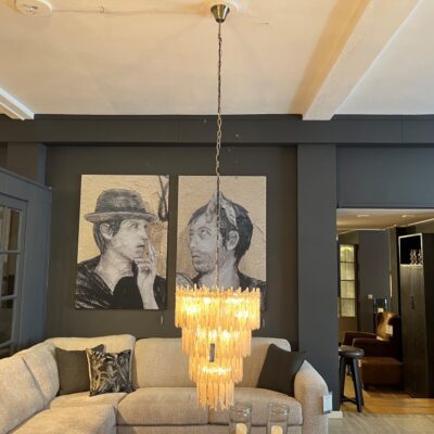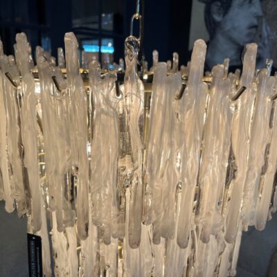 Lustre ‘Saint Roch S’de la marque Eichholtz. En raison d’un traitement spécial, le verre fumé a un effet de goutte, faisant ressembler les cristaux à des glaçons.