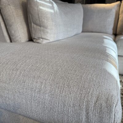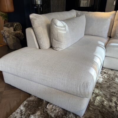 Le canapé Elina avec un fauteuil long à gauche et un siège de 2,5 places avec un accoudoir à droite. En tissu Pleat – Naturel 01 (D).
