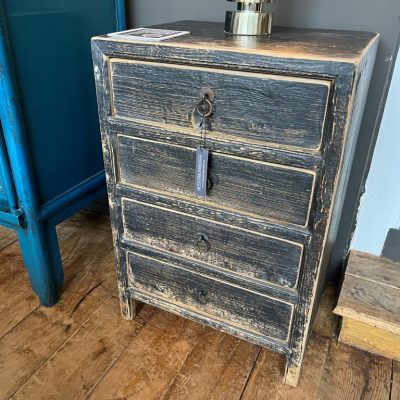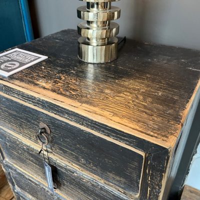 Table de chevet poncée noire ‘Granada’ avec 4 tiroirs, en vieux bois de pin.