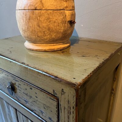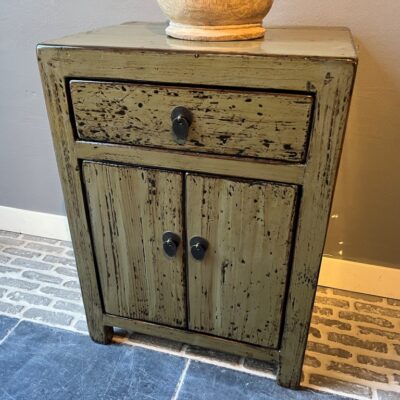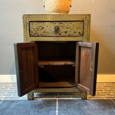 Armoire chinoise ancienne avec 1 tiroir et 2 portes, en vieux bois de pin. Le meuble est décoré de laque verte.