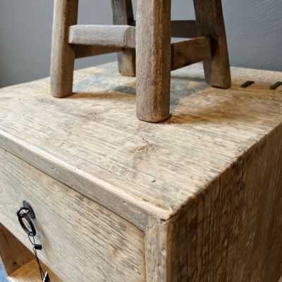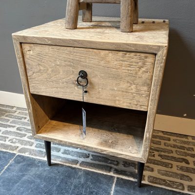 Table de chevet ‘Livorno’ avec 1 tiroir et une étagère inférieure, en vieux bois de pin. Existe également en noir.