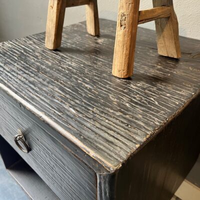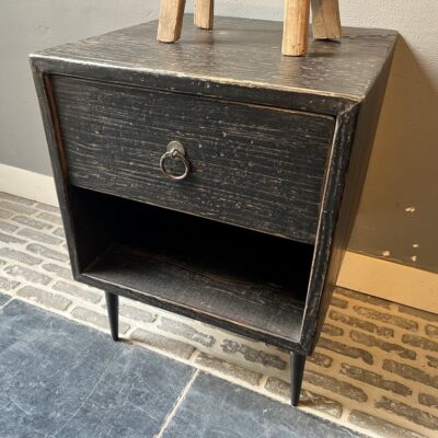 Table de chevet noire ‘Livorno’ avec 1 tiroir et une étagère inférieure, en vieux bois de pin. Existe également en vieux bois de pin naturel.