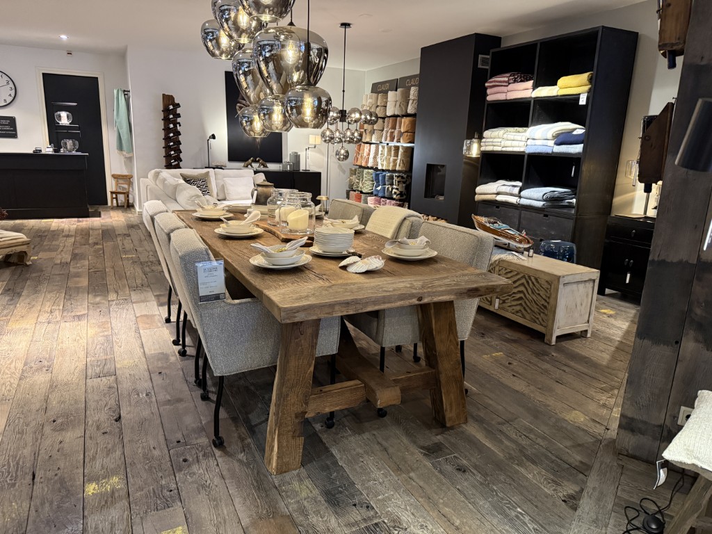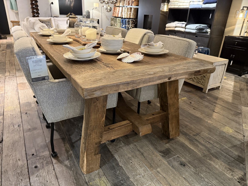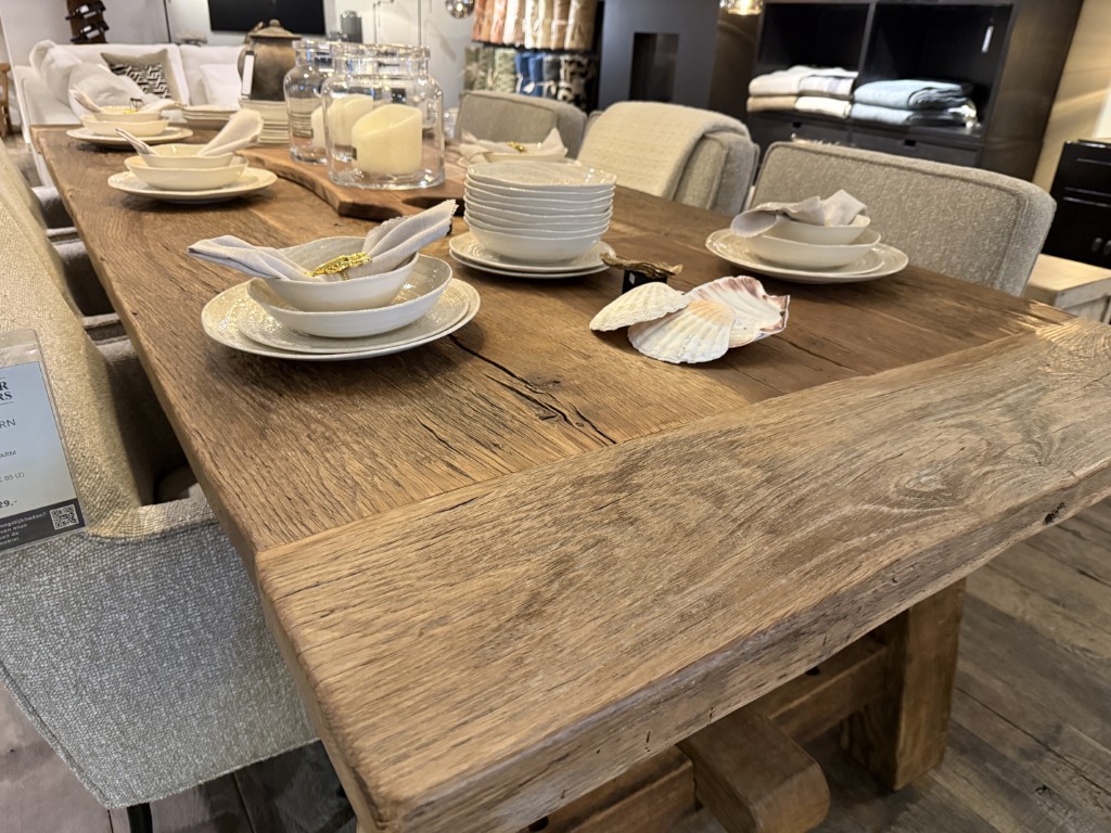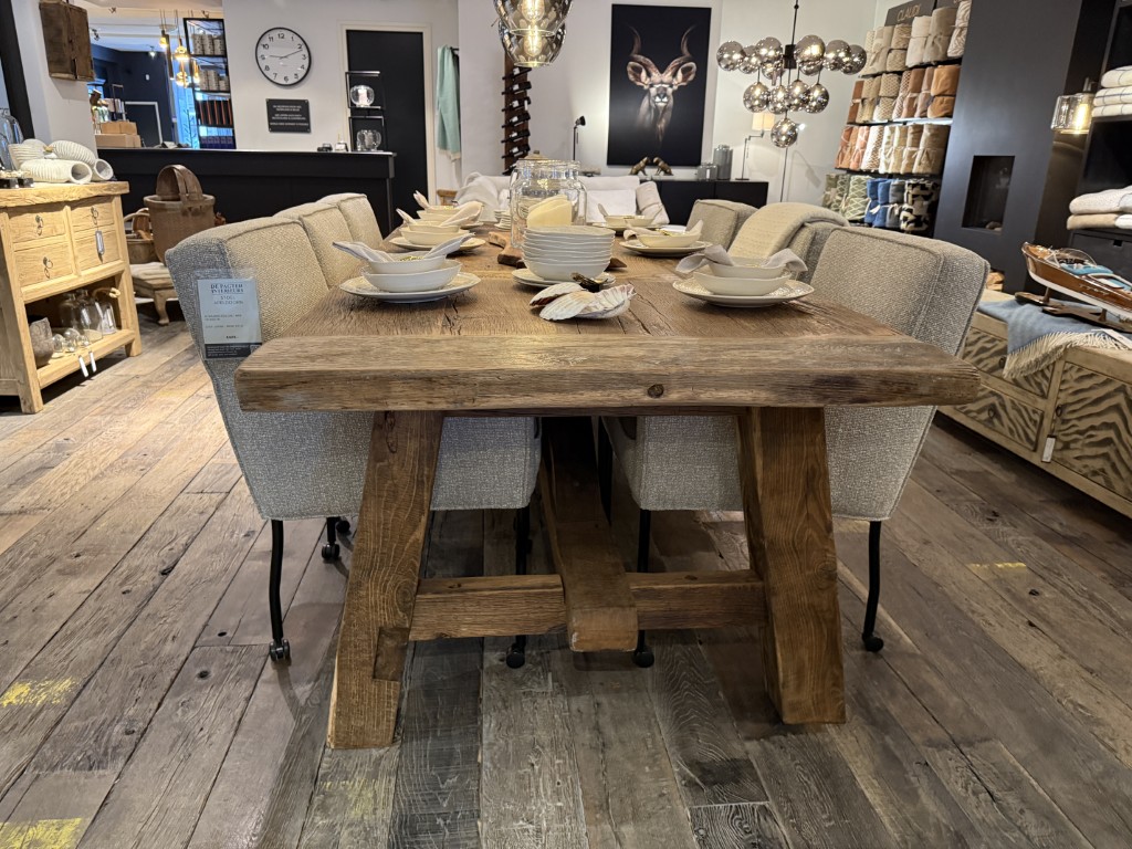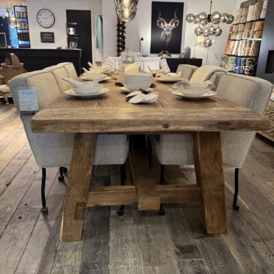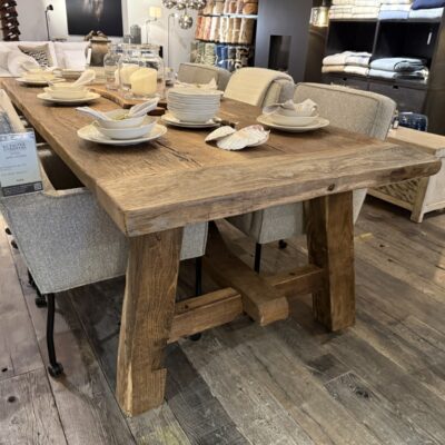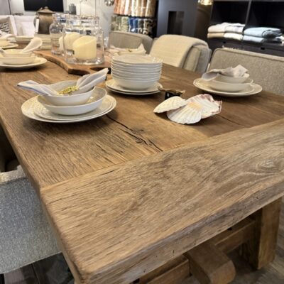 Table robuste avec une base en bois grossier, faite de vieux chêne vert. Également disponible dans d’autres tailles.