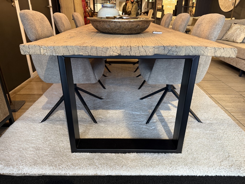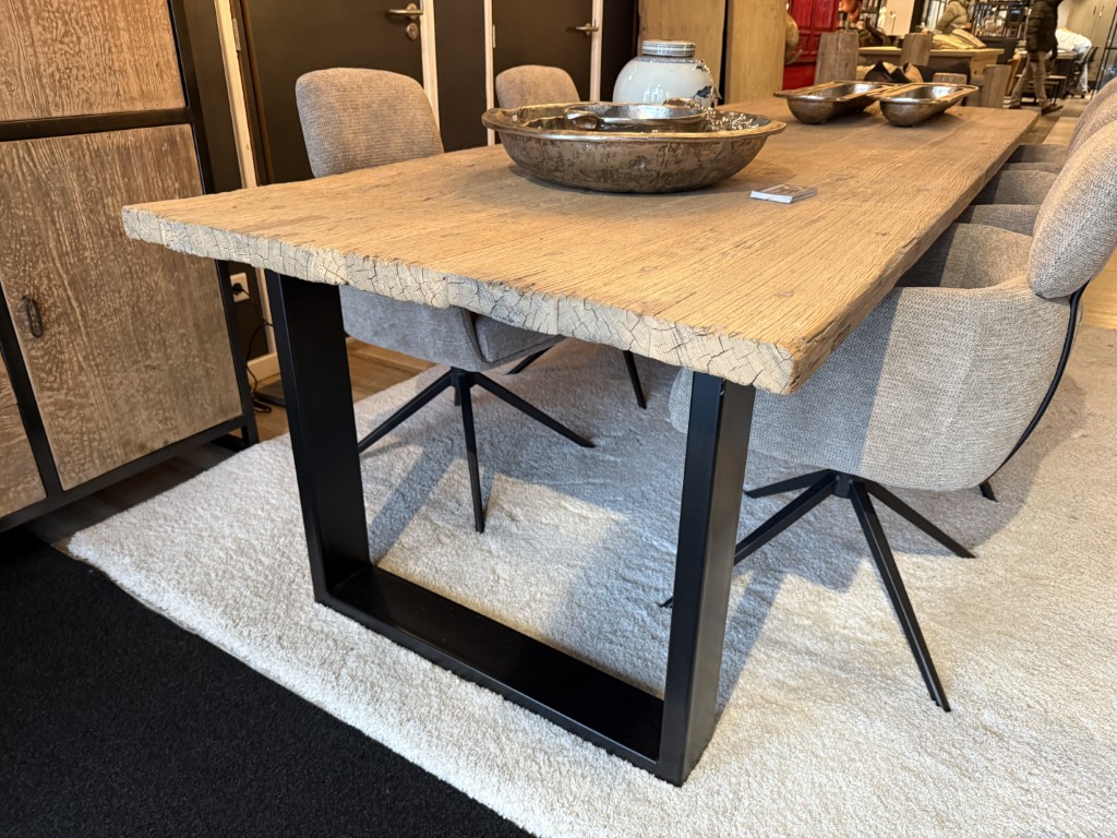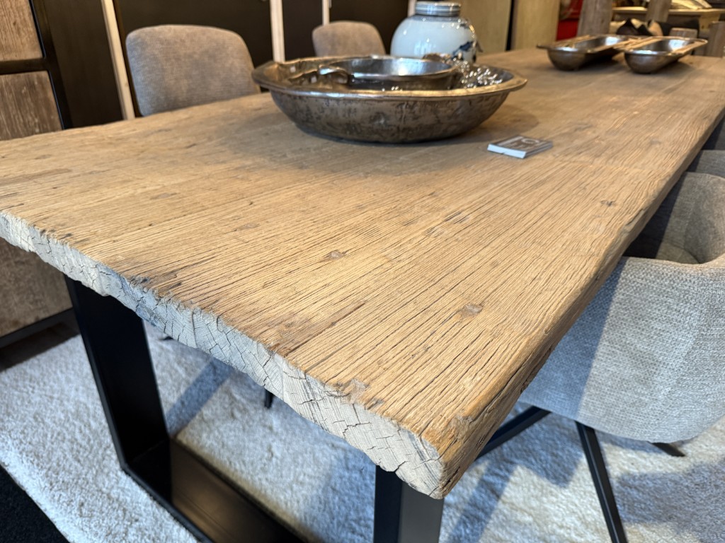 Table à manger, faite d’un plateau en orme et d’un cadre en métal noir.