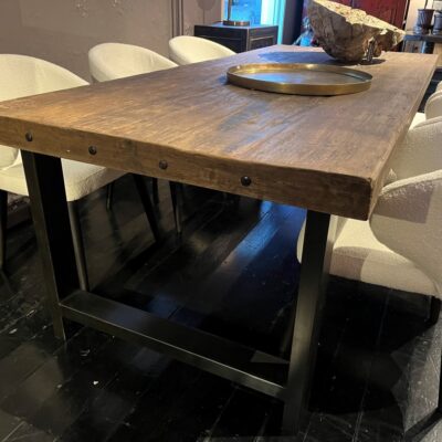 Table ‘Lima’ avec un plateau en bois dur et une base en métal.