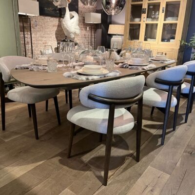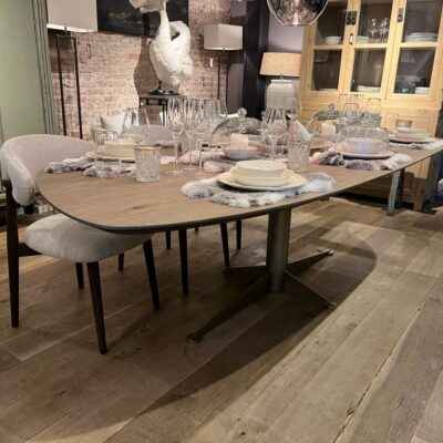 La table Modena est fabriquée en bois de chêne, de couleur Lava Light et de forme : Kiwi.