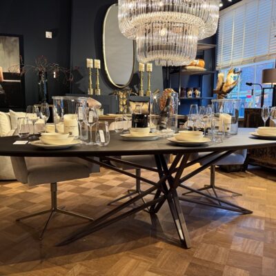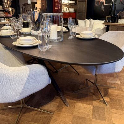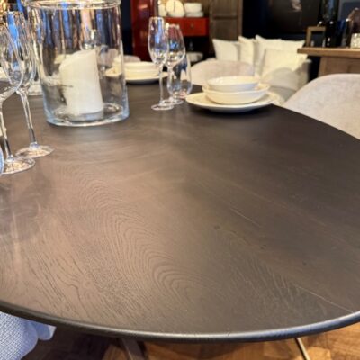 La table Modena est fabriquée en bois de chêne, de couleur Night Glow et de forme : Ovale.