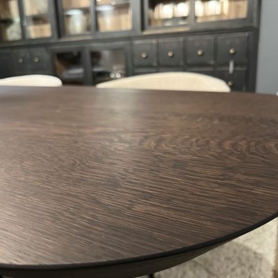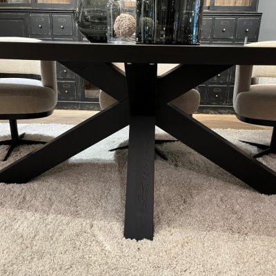 Table classique-moderne en chêne ‘Wengé’, soutenue par un pied araignée en chêne 10x10cm. Le prix est pour le modèle illustré. Découvrez toutes les options pour le tableau ici .