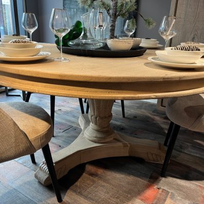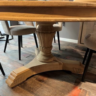 Table ronde rurale ‘Monza’ avec un pied décoratif en bois, en vieux bois de pin.
