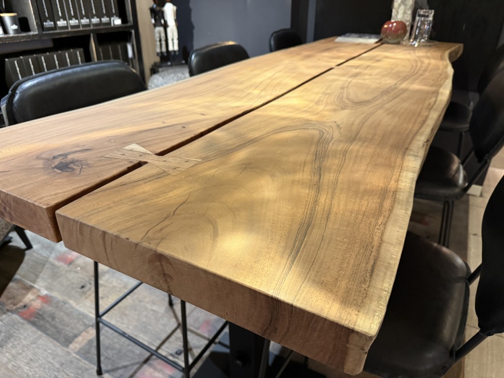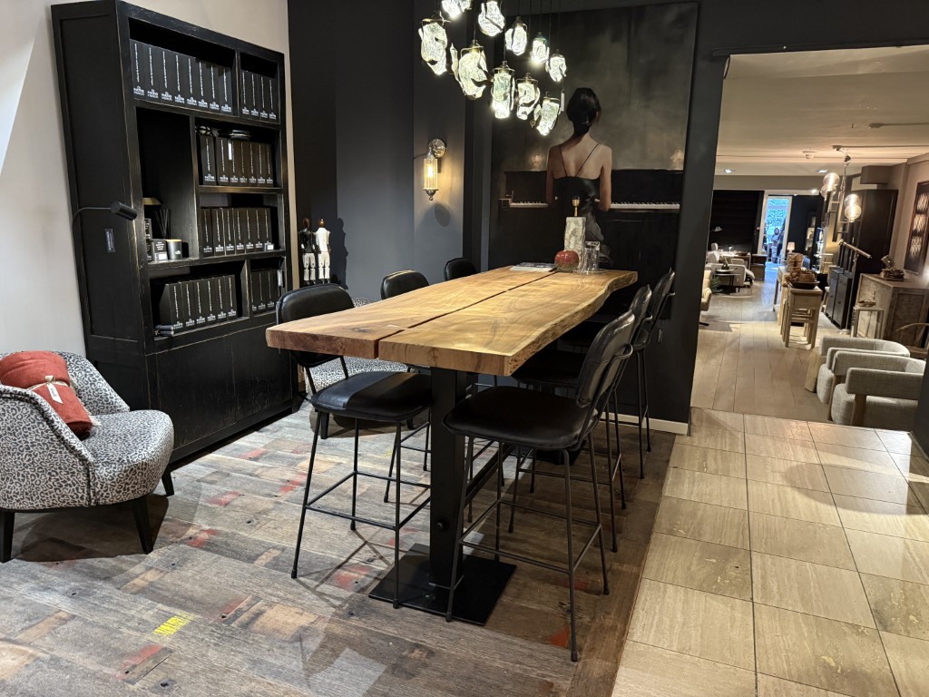 Table de bar, en plan en bois dur et en cadre métallique noir peint en poudre. Disponible aussi avec d’autres bases.